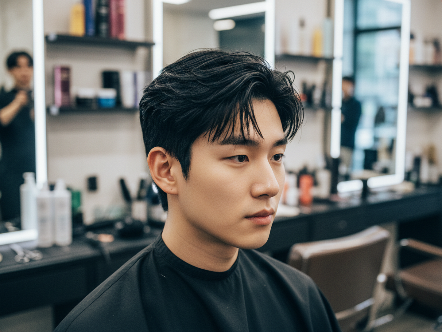 그의 앞머리는 무겁지 않으면서도 은은하게 내려오며, 윗머리는 자연스러운 C컬 볼륨으로 스타일링 되어있어요. 옆라인은 깨끗하게 정리가 되어 학생과 예술가의 분위기를 동시에 소유하고 있습니다.